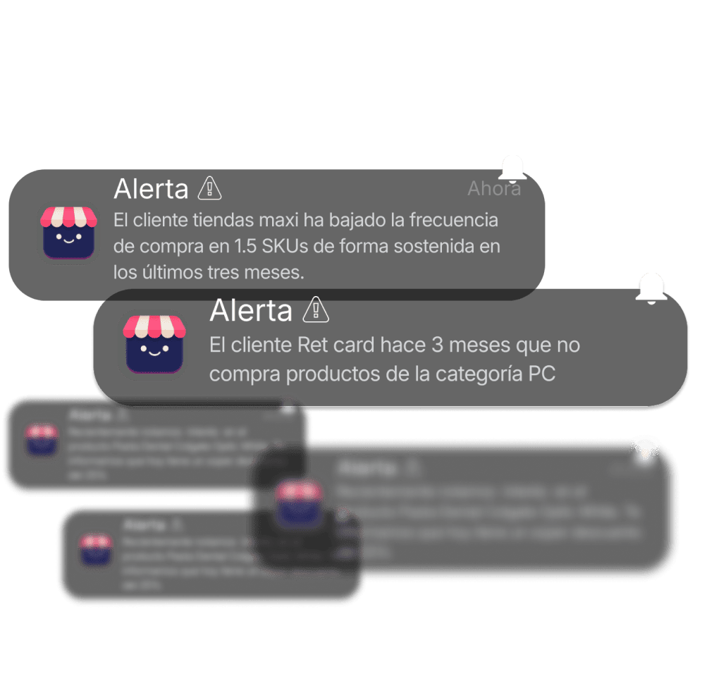 El sistema notifica automáticamente cambios críticos como caídas en ventas o quiebres de stock.
